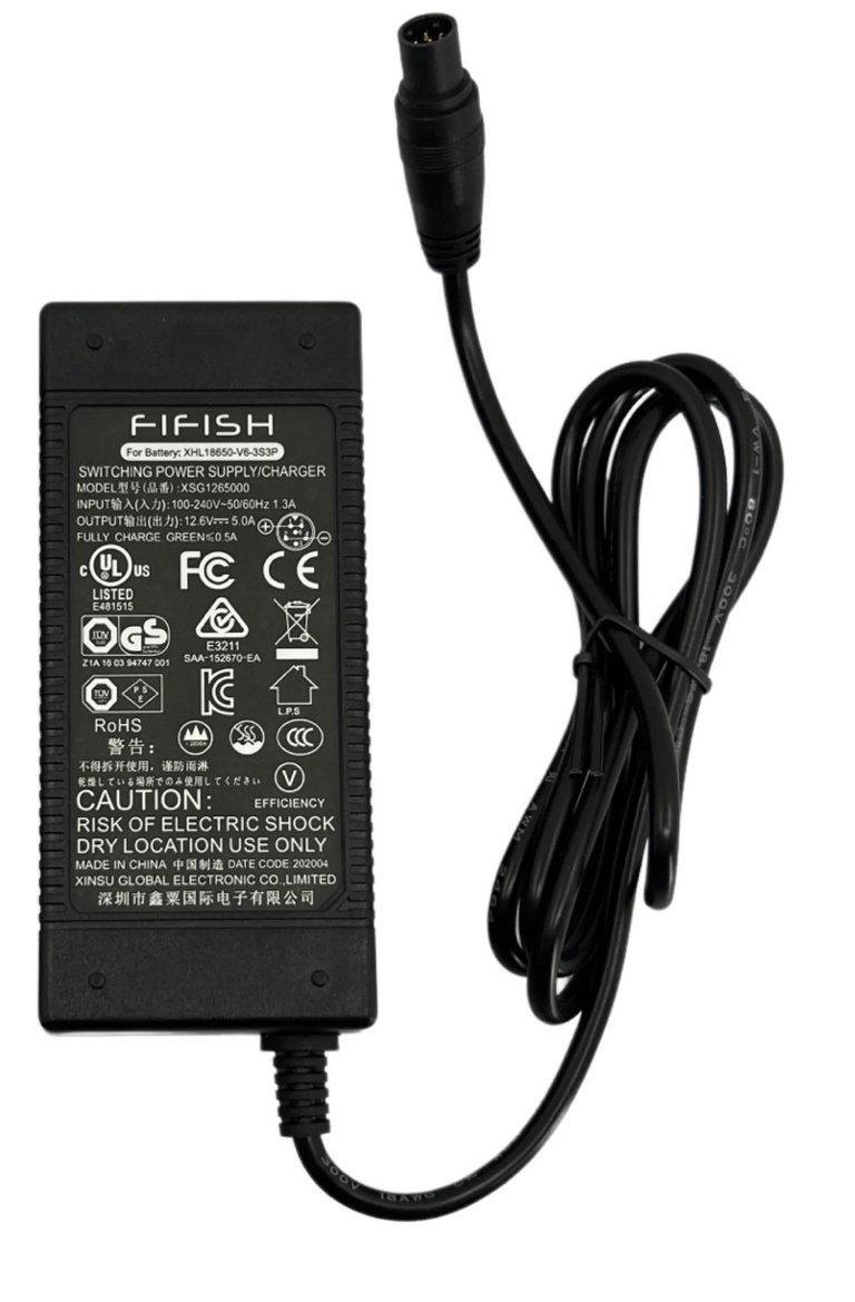 Power charger for the Fifish V6 underwater drone, featuring a 6-pin connection. Please note: Shipping time is 1 to 3 weeks. Input voltage: 100–240V ~ 50/60Hz, 1.3A